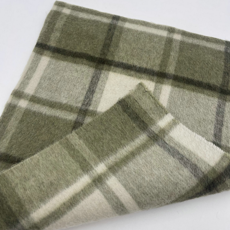 Este tecido, designado como artigo ZZH25001, é um tecido grosso composto por 30% de lã e 70% de outras fibras. Com massa por unidade de área de 900g/m2, o material apresenta densidade e peso substanciais. A superfície apresenta um padrão xadrez verde com efeito de sombra criado através de técnicas de tecelagem especializadas. Este método de construção produz profundidade visual em camadas dentro da formação da grade. A inclusão de fibras de lã na mistura influencia as propriedades de regulação térmica do tecido. Essas especificações técnicas resultam em um tecido pesado adequado para peças estruturadas onde são necessárias textura pronunciada e presença substancial.