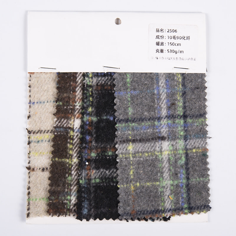 Tecido xadrez de fibra química de lã para vidraça com escova para roupas 2506 combina habilmente 10% de lã de alta qualidade e 90% de fibra química de alta qualidade. Ele não apenas retém o calor natural e a respirabilidade da lã, mas também destaca as vantagens da resistência ao desgaste da fibra química, do cuidado fácil e das cores brilhantes, proporcionando uma experiência de uso sem precedentes. Seu processo exclusivo de escovação forma uma camada de penugem delicada e macia na superfície do tecido, que é suave, como se acariciasse suavemente um prado de lã no início da primavera, fazendo com que as pessoas se sentissem aquecidas e confortáveis. Esta camada de penugem não só aumenta a retenção de calor do tecido, mas também lhe confere um efeito visual único, permitindo que o tecido apresente um brilho encantador e camadas sob a luz. O desenho do padrão xadrez é outro destaque deste tecido. Também damos especial atenção à praticidade e durabilidade do tecido. O teor de 90% de fibra química faz com que este tecido tenha boa resistência a rugas e ao desgaste. Mesmo depois de várias lavagens e usos, ele ainda pode permanecer plano e novo e não é fácil de deformar ou desbotar. A adição de lã permite que o tecido tenha boa absorção de umidade e desempenho de transpiração enquanto se mantém aquecido, para que sua pele fique seca e confortável enquanto desfruta do calor.