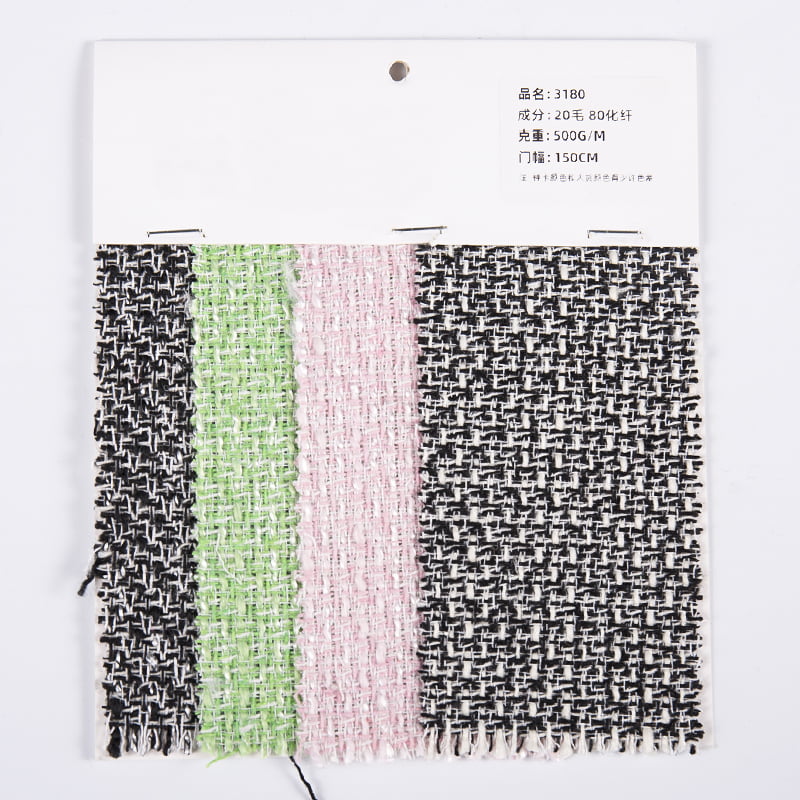 O tecido de tweed de lã com padrão de casca de melão 3180 é uma obra-prima de tweed de lã que é engenhosa e combina charme natural com tecnologia moderna. Ele usa habilmente 20% de lã de alta qualidade e 80% de misturas de fibras químicas de alto desempenho, que não apenas retém o calor natural e o toque delicado da lã, mas também melhora muito a resistência ao desgaste, a resistência a rugas e as propriedades de fácil manutenção do tecido. , permitindo que o clássico e a modernidade coexistam harmoniosamente em cada centímetro do tecido. O vívido padrão de casca de melão é cuidadosamente tecido no tecido. Este design é inspirado nos elementos frescos da natureza. Com texturas delicadas e contraste de cores vivas, confere um estilo pastoral único às roupas. O verde e o branco da casca do melão se entrelaçam, como uma brisa de verão, trazendo um toque de frescor e devaneio infinito, permitindo ao usuário sentir a vitalidade e vitalidade da natureza em qualquer estação. Este tecido é cheio e macio, e o processo de tecelagem de tweed confere-lhe uma sensação tridimensional única e uma beleza em camadas. Quer seja um casaco estilo retro, um vestido elegante ou uma calça casual, pode ser facilmente controlado, mostrando o gosto de moda único e o temperamento extraordinário do usuário.