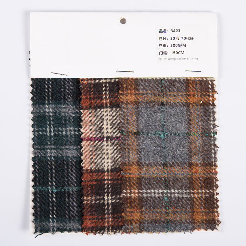 Tecido clássico de tweed de lã xadrez para roupas no inverno 3423 adota o design clássico de padrão xadrez. Este elemento tem uma longa história na indústria da moda e sempre manteve seu charme e status únicos. Através da tecnologia de tecelagem fina, o padrão xadrez é apresentado de forma vívida no tecido, que não só mantém o charme retro das roupas tradicionais, mas também incorpora a simplicidade e a moda do design moderno, tornando o tecido altamente reconhecível visualmente e atraente. Em termos de material, 3.423 tecidos selecionam 30% de lã de alta qualidade como material principal. Como material de isolamento térmico natural, a lã tem boa higroscopicidade e respirabilidade, o que pode efetivamente fixar a temperatura corporal e fornecer ao usuário calor e conforto duradouros. Ao mesmo tempo, o toque macio da lã também melhora muito a suavidade do tecido e a experiência de uso. Para aumentar ainda mais a praticidade e durabilidade do tecido, 70% de componentes de fibra química de alta qualidade são adicionados ao tecido 3423. Os materiais de fibra química são conhecidos por sua excelente resistência a rugas e ao desgaste, o que pode garantir que o tecido permaneça plano e nítido durante o uso a longo prazo e não seja propenso a deformação ou desgaste. Além disso, as características de fácil manutenção dos materiais de fibra química também tornam o tecido mais fácil de manter e adequado para vários métodos de lavagem, o que prolonga muito a vida útil das roupas.