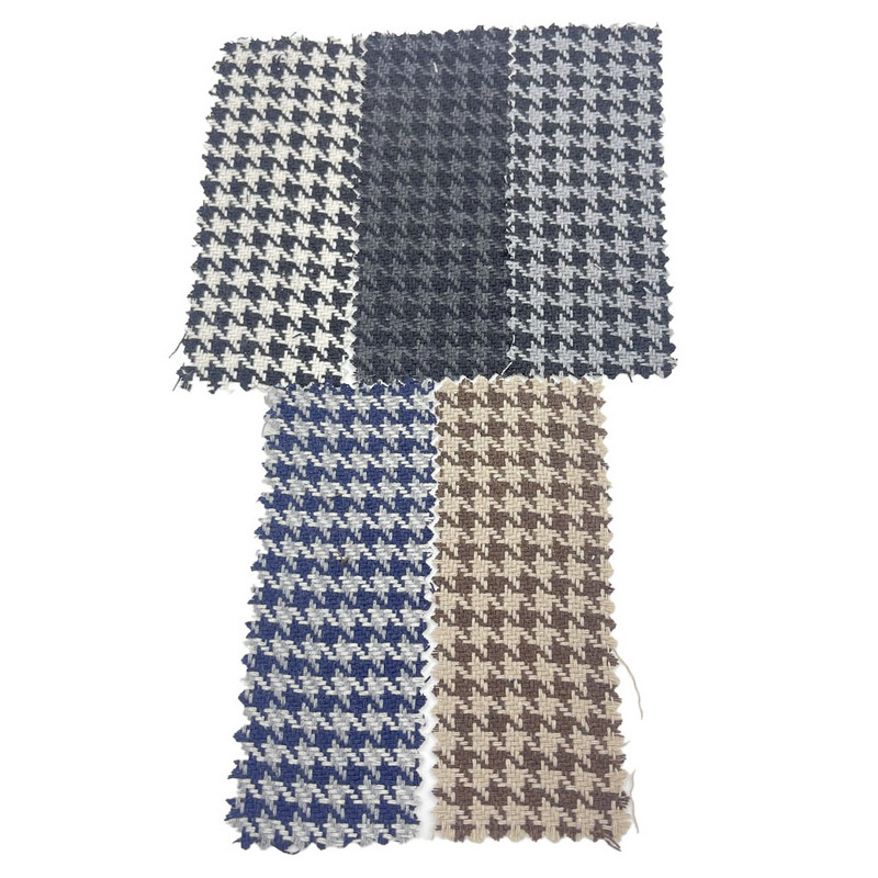 Este tecido, designado artigo 3946, é um tecido composto por 10% de lã e 90% de outras fibras. Com massa por unidade de área de 450 g/m2, apresenta construção de peso médio. A superfície cinza escuro apresenta um padrão houndstooth, criado através de uma técnica de tecelagem específica que produz xadrez quebrado ou formas de quatro pontas. Este motivo geométrico clássico é caracterizado pelo seu efeito tonal contrastante e repetido. A composição da mistura de lã contribui para a regulação térmica e resiliência do tecido. Essas características técnicas resultam em um material com articulação de padrão definido e durabilidade estrutural, tornando-o aplicável para moletons onde são necessários definição visual de padrão e desempenho de longo prazo.