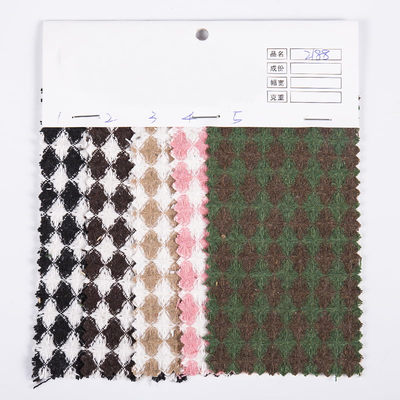 O tecido jacquard em relevo Diamond Check 2188 é um tecido profissional feito 100% de fibra química. O tecido usa o exclusivo padrão de diamante como elemento central do design. Através da avançada tecnologia jacquard, este padrão clássico é tecido com precisão na superfície do tecido. Cada nó de diamante é cuidadosamente processado para garantir a integridade e clareza do padrão, mostrando um alto nível de habilidade e controle de detalhes. Em termos de seleção de material, o tecido 2188 utiliza fibra química de alta qualidade para garantir durabilidade, resistência a rugas e fácil cuidado do tecido. Com suas propriedades físicas e químicas estáveis, a fibra química confere ao tecido boa estabilidade dimensional e não é fácil de deformar ou encolher. Ao mesmo tempo, a resistência ao desgaste e ao rasgo da fibra química também melhora muito a vida útil do tecido, para que ele possa manter excelente desempenho em diversos cenários de aplicação. Além da requintada tecnologia jacquard e materiais de fibra química de alta qualidade, o tecido 2188 também usa tecnologia de relevo para melhorar ainda mais a textura e o efeito visual do tecido. A tecnologia de relevo realiza um tratamento especial na superfície do tecido para que apresente um efeito tridimensional delicado e em camadas, potencializando o toque e o efeito visual do tecido. Este design exclusivo em relevo não apenas melhora a qualidade geral do tecido, mas também o torna mais atraente em diversas aplicações decorativas e de vestuário.