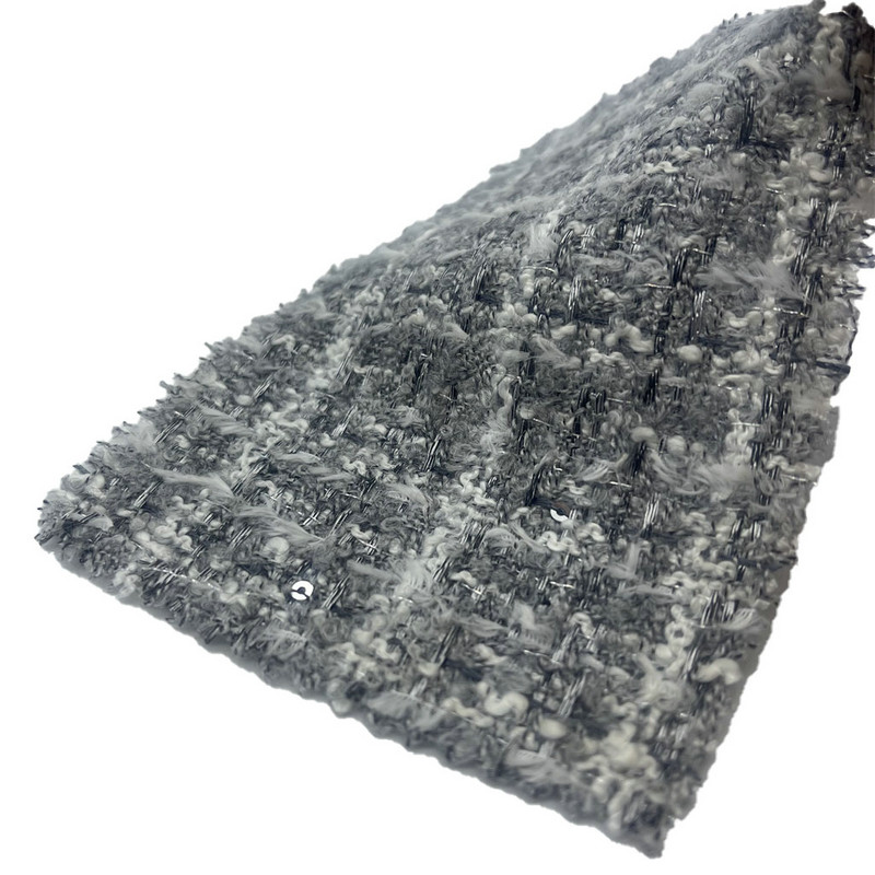 Este tecido, designado artigo 23503, é um tecido tweed composto por 49% acrílico, 40% poliéster, 7% lã e 4% nylon. Com massa por unidade de área de 335 g/m², apresenta uma construção leve, porém estruturada. A superfície apresenta um fino padrão xadrez cinza, obtido através de um processo de relevo que cria uma textura sutil em relevo no tecido. Esta técnica aumenta a profundidade visual da manta sem alterar a base tecida. A mistura multifibra combina a estabilidade do poliéster, a resiliência do acrílico, o toque natural da lã e a durabilidade do náilon. Essas características tornam o tecido adequado para roupas femininas onde são necessários padrões detalhados e interesse tátil.