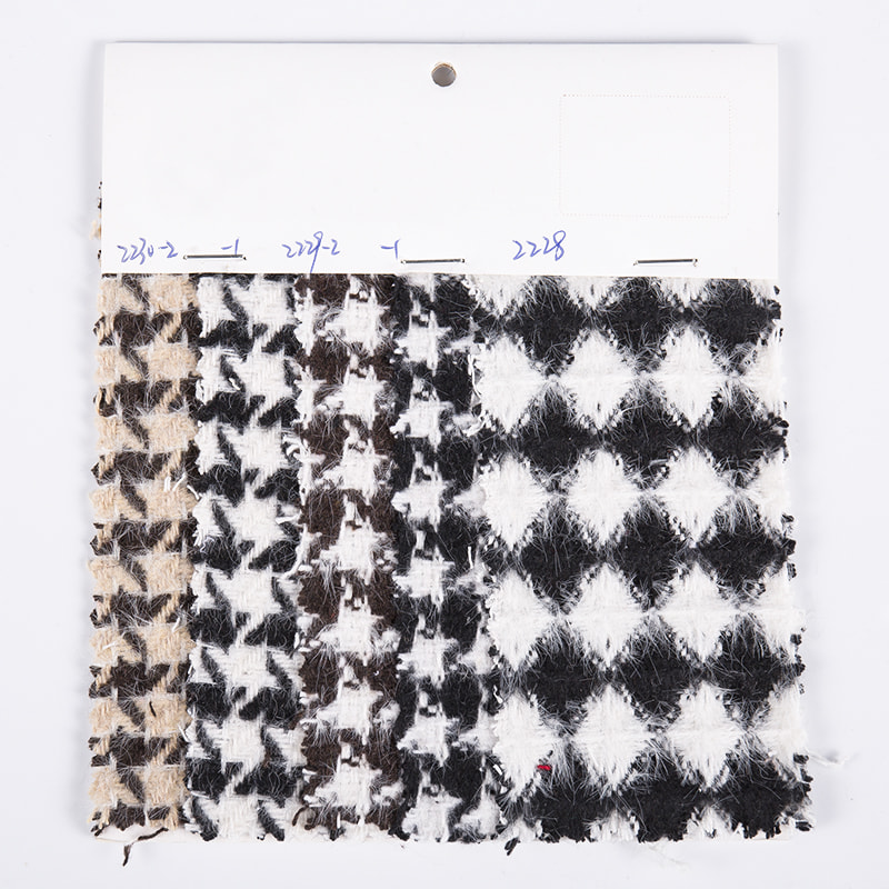 A característica distintiva do tecido Long Hair Diamond Houndstooth Tweed 2230/2229/2228 é a tecnologia exclusiva de processamento de cabelos longos, que combina o formato clássico de diamante e o padrão houndstooth para formar um patchwork e efeito visual em camadas. Este design inovador não só confere ao tecido um elevado grau de reconhecimento, mas também o destaca entre muitos produtos similares. Do ponto de vista da composição do material, o tecido é feito com matéria-prima 100% de fibra química, garantindo excelentes propriedades físicas e estabilidade química. O material de fibra química, com boa resistência ao desgaste, resistência a rugas e fácil manutenção, permite que este tecido mantenha sua forma nítida e cor brilhante durante o uso a longo prazo. Ao mesmo tempo, a higroscopicidade, a respirabilidade e outros indicadores das fibras químicas também são rigorosamente controlados para garantir uma experiência confortável durante o uso. O artesanato do tweed houndstooth de lã longa e diamante também é louvável. A utilização de tecnologia e equipamentos têxteis avançados permite que o tecido mantenha uma textura áspera e ao mesmo tempo tenha um toque delicado. Os fios da urdidura e da trama são entrelaçados de maneira firme e uniforme, garantindo a resistência e estabilidade do tecido. Em termos de campos de aplicação, o tecido de tweed houndstooth diamante de cabelo longo é amplamente utilizado em moda de alta costura, ternos elegantes e diversos tecidos decorativos devido ao seu design exclusivo e excelente desempenho.