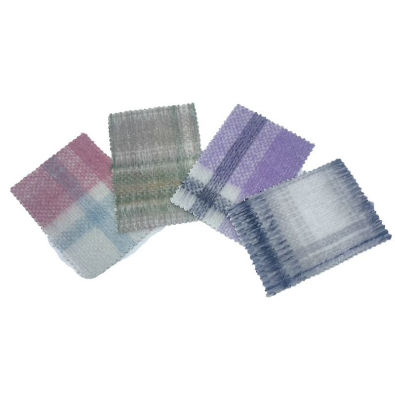 Este tecido, designado artigo 3940, é um tecido jacquard composto por 10% de lã e 90% de outras fibras. Com massa por unidade de área de 600 g/m2, apresenta construção pesada. A superfície roxa combina um padrão xadrez com uma textura de pêlo longo, obtida através de técnicas especializadas de tecelagem e acabamento em jacquard. Este processo de fabricação cria laços de fibra estendidos na superfície do tecido, resultando em uma estrutura tridimensional pronunciada. A composição da mistura de lã contribui para as propriedades de isolamento térmico e resiliência do tecido. Estas características técnicas produzem um material com profundidade e volume superficial substanciais, tornando-o aplicável para sobretudos onde são necessários elevado calor e dimensão textural.