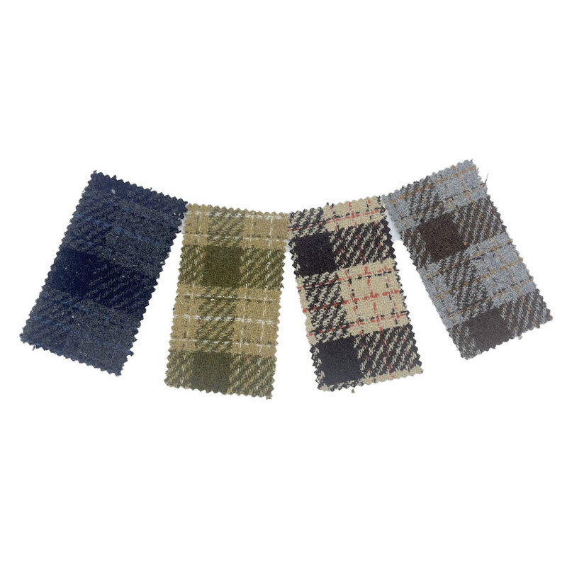 Este tecido, designado artigo 4144, é um tecido jacquard tweed composto por 10% de lã e 90% de outras fibras. Com massa por unidade de área de 550 g/m2, apresenta construção pesada. A superfície verde combina uma base em sarja com padrões xadrez listrados, criados através do processo jacquard que integra faixas lineares com formações de grade. Esta técnica produz padrões que se cruzam sobre a textura característica da sarja diagonal. A composição da mistura de lã contribui para a estabilidade dimensional e durabilidade do tecido. Essas características técnicas resultam em um material com padronização multicamadas e densidade estrutural, tornando-o aplicável em peças de vestuário onde são necessários elementos de design complexos e resiliência do tecido.